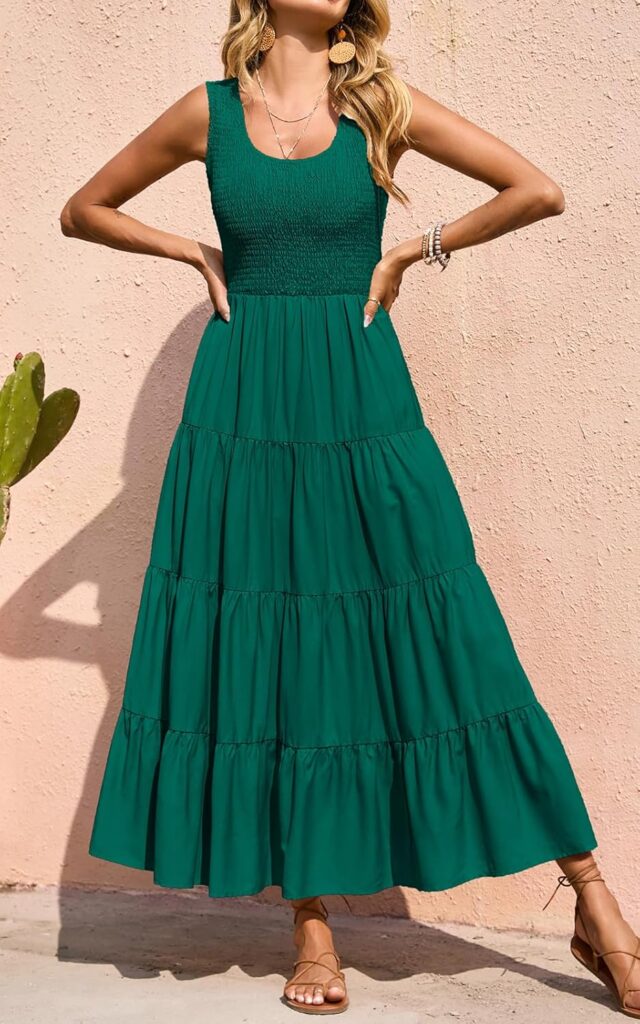 Refresh your wardrobe with this elegant Green Tiered Maxi Dress, designed for comfort, style, and effortless summer fashion. This sleeveless dress features a smocked tank bodice that provides a flattering stretch fit while highlighting your natural silhouette. The flowy tiered skirt creates graceful movement, making it perfect for warm-weather days.